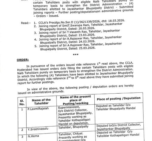 జయశంకర్ భూపాలపల్లి జిల్లాలో 14 మంది తహసిల్దార్ మరియు న్యాయ తహసిల్దారులను బదిలీ చేస్తూ జిల్లా కలెక్టర్ రాహుల్ శర్మ ఉత్తర్వులు జారీ చేశారు. తక్షణమే వీధుల్లో వారికి కేటాయించిన స్థానాల్లో చేరి సంబంధిత చేరిక నివేదికను సమర్పించాలని అన్నారు కలెక్టర్. అధికారులు విధుల్లో చేరడంలో ఆలస్యం చేయకుండా ప్రభుత్వ పరిపాలన పనులను నిరంతరంగా సాగుటకు సహకరించాలని సూచించారు కలెక్టర్, బదిలీ అయినా తాసిల్దార్ మరియు డిప్యూటీ తాసిల్దార్ ల వివరాలు. జిల్లా కలెక్టర్ కార్యాలయంలో సుప్రీడెంట్ గా విధులు నిర్వహిస్తున్న పి లక్ష్మీరాజం, ను తాసిల్దార్ భూపాల్ పల్లి గా నియమించడం జరిగింది. అలాగే వై శ్రీనివాసులు తాసిల్దార్ భూపాలపల్లి కు జిల్లా కలెక్టర్ కార్యాలయానికి బదిలీ చేసింది, అలాగే ఇన్ హిమ చిట్యాల తహసిల్దార్ కు తాసిల్దార్ కొత్త పల్లగురి మండల్, కి విజయలక్ష్మి తహసిల్దార్ టేకుమట్ల కు, సబ్ కలెక్టర్ కాటారం కు బదిలీ బదిలీ చేశారు. అలాగే ఎం సత్యనారాయణ స్వామి తాసిల్దార్ ఘన్పూర్ ను, మహాదేవపూర్ తాసిల్దారుగా, అలాగే వై రమణ రావు తాసిల్దార్ మహదేవ్పూర్ ను డిస్టిక్ కలెక్టర్ కార్యాలయానికి బదిలీ చేశారు. రేపల్లి రాజేశ్వర్ తాసిల్దార్ పలిమెల, వసంతరావు ను సూపర్డెంట్ డిస్టిక్ కలెక్టర్ కార్యాలయం తో పాటు తహసిల్దార్ చిట్యాల గా అదనపు బాధ్యతలను అప్పగించారు. అలాగే అల్లూరి రాజేశ్వరరావు తహసిల్దార్ కొత్తపల్లి గౌరీ, తో పాటు అదనపు బాధ్యతలు తహసిల్దార్ ఘన్పూర్ మండల్ గా నియమించారు. ఏ అనిల్ తాసిల్దార్ పలివెలకు నాయక్ తాసిల్దార్ చిట్యాల కు బదిలీ చేశారు, అలాగే ఇమామ్ బాబా షేర్ నాయక్ తహసిల్దార్ ఎలక్షన్ కు డిప్యూటీ తహసిల్దార్ మహాముత్తారం గా జీవించడం జరిగింది. అలాగే డి సందీప్ నాయక్ తహసిల్దార్ మహాముత్తారంకు డిప్యూటీ తాసిల్దార్ మల్హర్రావు మండలానికి బదిలీ చేస్తూ జిల్లా కలెక్టర్ రాహుల్ శర్మ ఉత్తర్వులు జారీ చేయడం జరిగింది.
