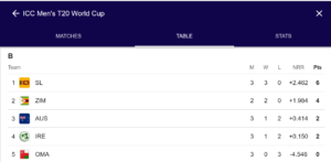 గ్రూప్ బిలో శ్రీలంక మూడు మ్యాచ్ లు ఆడి మూడు గెలిచి 6 పాయింట్లతో మొదటి స్థానంలో ఉంది. జింబాబ్వే రెండు మ్యాచ్ లు ఆడి రెండు గెలిచి 4 పాయింట్లతో రెండో స్థానంలో ఉంది. అస్ట్రేలియా మూడు మ్యాచ్ లు ఆడి 2 ఓడిపోయి ఒకటి గెలిచి 2 పాయింట్లతో మూడో స్థానంలో ఉంది. ఐర్లాండ్ మూడు మ్యాచ్ లు ఆడి 1 మ్యాచ్ గెలిచి 2 పాయింట్లతో ఉంది. ఒమన్ 3 మ్యాచ్ లు ఓడిపోయింది.