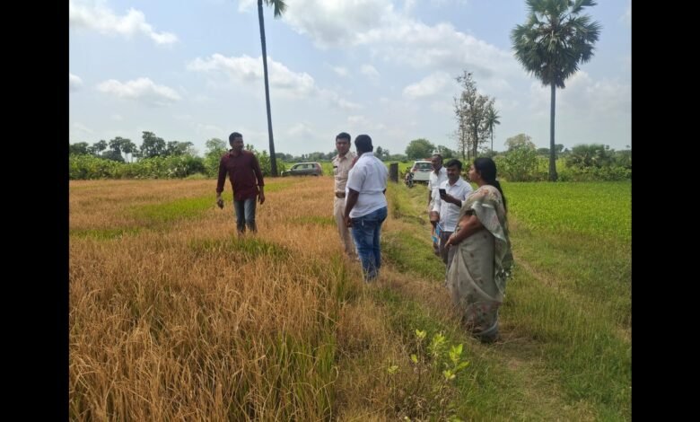 పంట పొలాన్ని పరిశీలిస్తున్న ప్రభుత్వ అధికారులు.