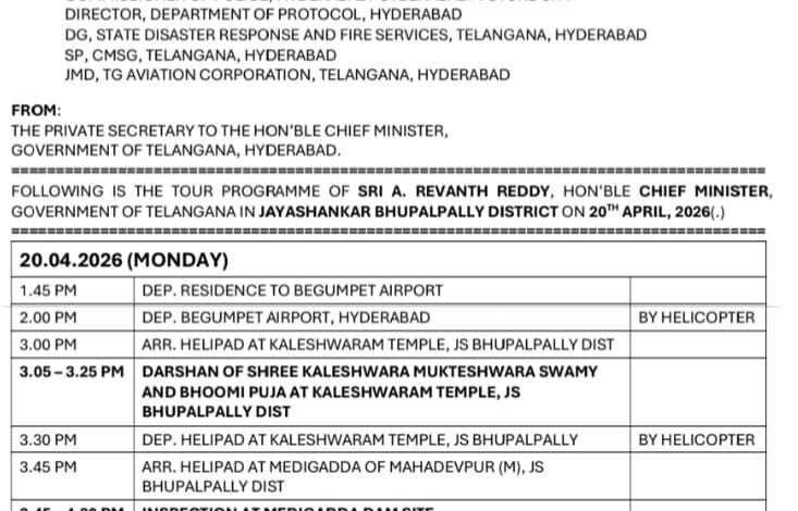 రాష్ట్ర ముఖ్యమంత్రి ఏ. రేవంత్ రెడ్డి ఏప్రిల్ 20వ తేదీ సోమవారం జయశంకర్ భూపాలపల్లి జిల్లా పర్యటాన వివరాలు,మధ్యాహ్నం 1.45 గంటలకు నివాసం నుంచి బయలుదేరి